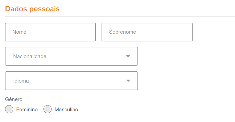 Primeiramente preencha seus dados pessoais: Nome, sobrenome, nacionalidade, idioma e marque o gênero.