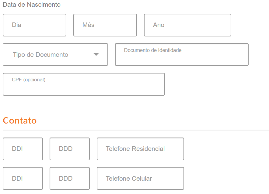 Os campos de contato devem ser preenchidos com os telefones residencial e celular, incluindo o DDI e o DDD.