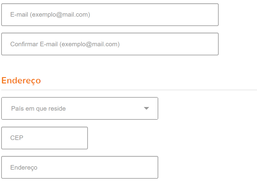 Continue o preenchimento inserindo o país de sua residencia, o CEP e o nome da rua no campo endereço.